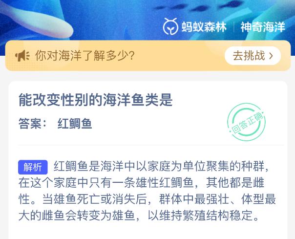 能改变性别的海洋鱼类是?【神奇海洋】2026年4月23日新题目已开答!正确答案现已公布,点击领取拼图,一起为修复海洋生态贡献力量!今日正确答案是:【红鲷鱼】。红鲷鱼中当雄鱼死亡或消失后,群体中最强壮、体型最大的雌鱼会转变为雄鱼,以维持繁殖结构稳定。