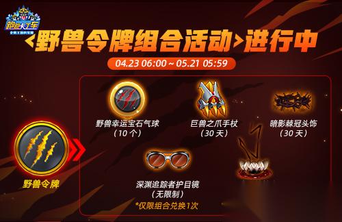 野兽令牌组合活动>在 5月21日05:59前限时开放,组合不同数量的“野兽令牌”可获得 “暗影棘冠头饰(30天)”、“深渊追踪者护目镜(无限制)”、“狂啸野兽炫光(无限制)”等道具奖励,车手们可通过以下途径来获得“野兽令牌”: