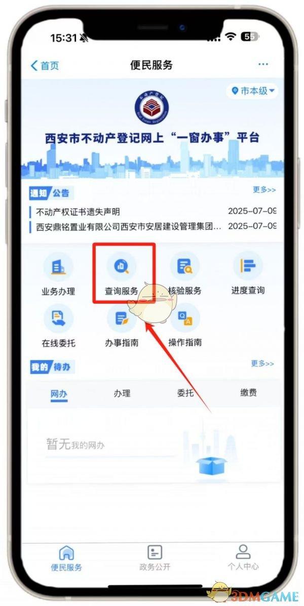 在【首页】点【不动产】,进入服务专区后,点击【查询服务】选择对应服务事项。