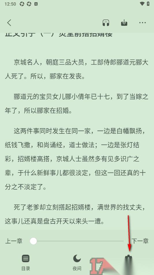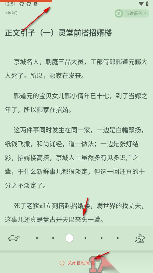 5.随后页面顶部的位置即可显示出一条红色的进度条,当进度条完成之后即可翻到下一页阅读,点击页面还可以在底部设置翻页速度。