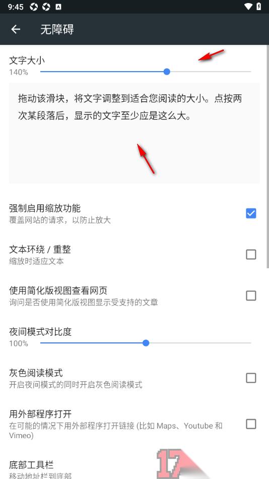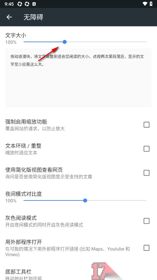 4.随后页面上即可展示出多种设置内容,在页面顶部将文字大小的滑块向右侧或者是左侧移动即可调节大小。