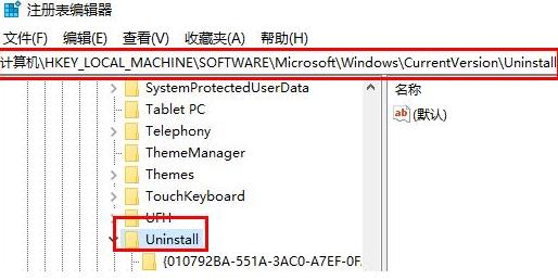 2、进入注册表编辑器后,将"HKEY_LOCAL_MACHINE/SOFTWARE/Microsoft/windows/CurrentVersion/Uninstall"复制到上方地址栏中并回车定位到此,如图所示。