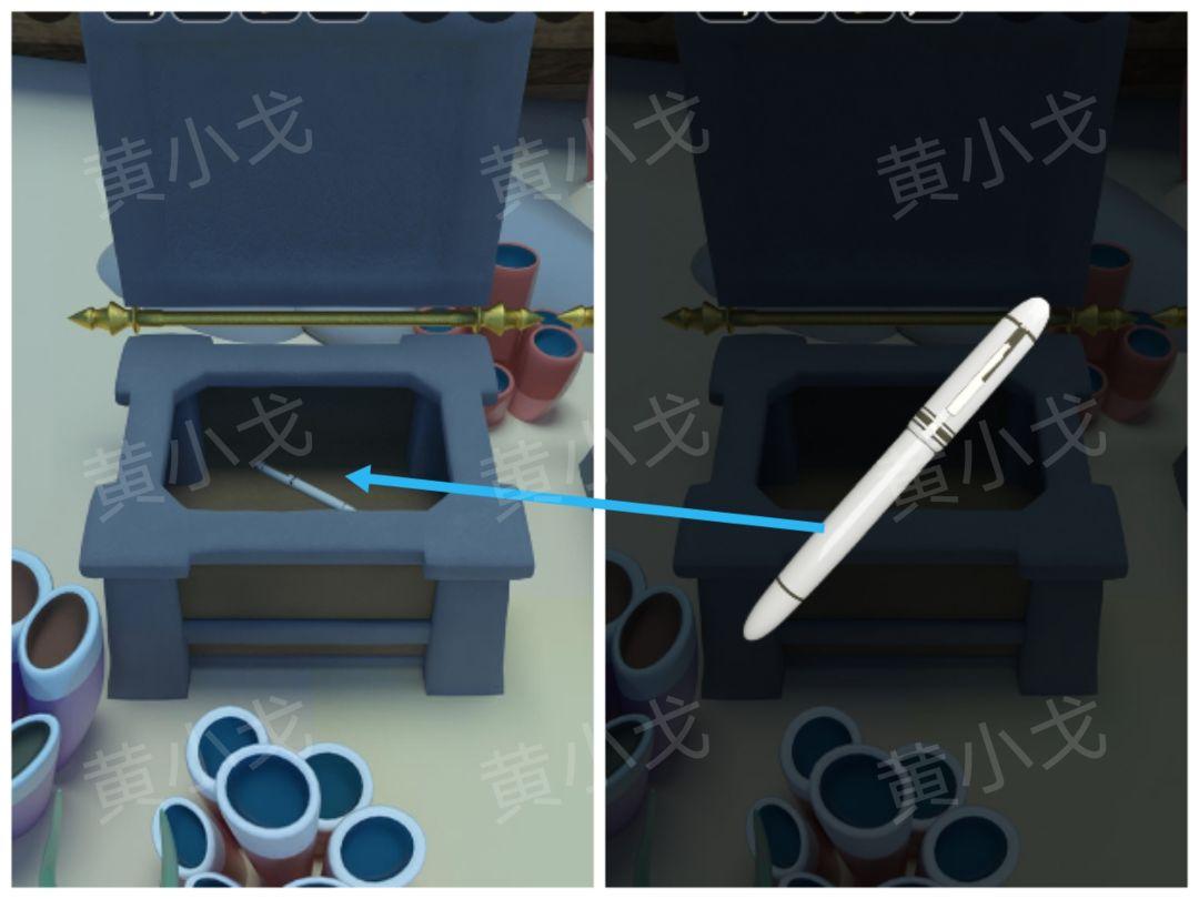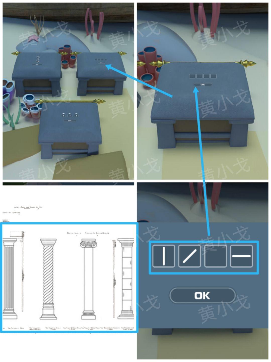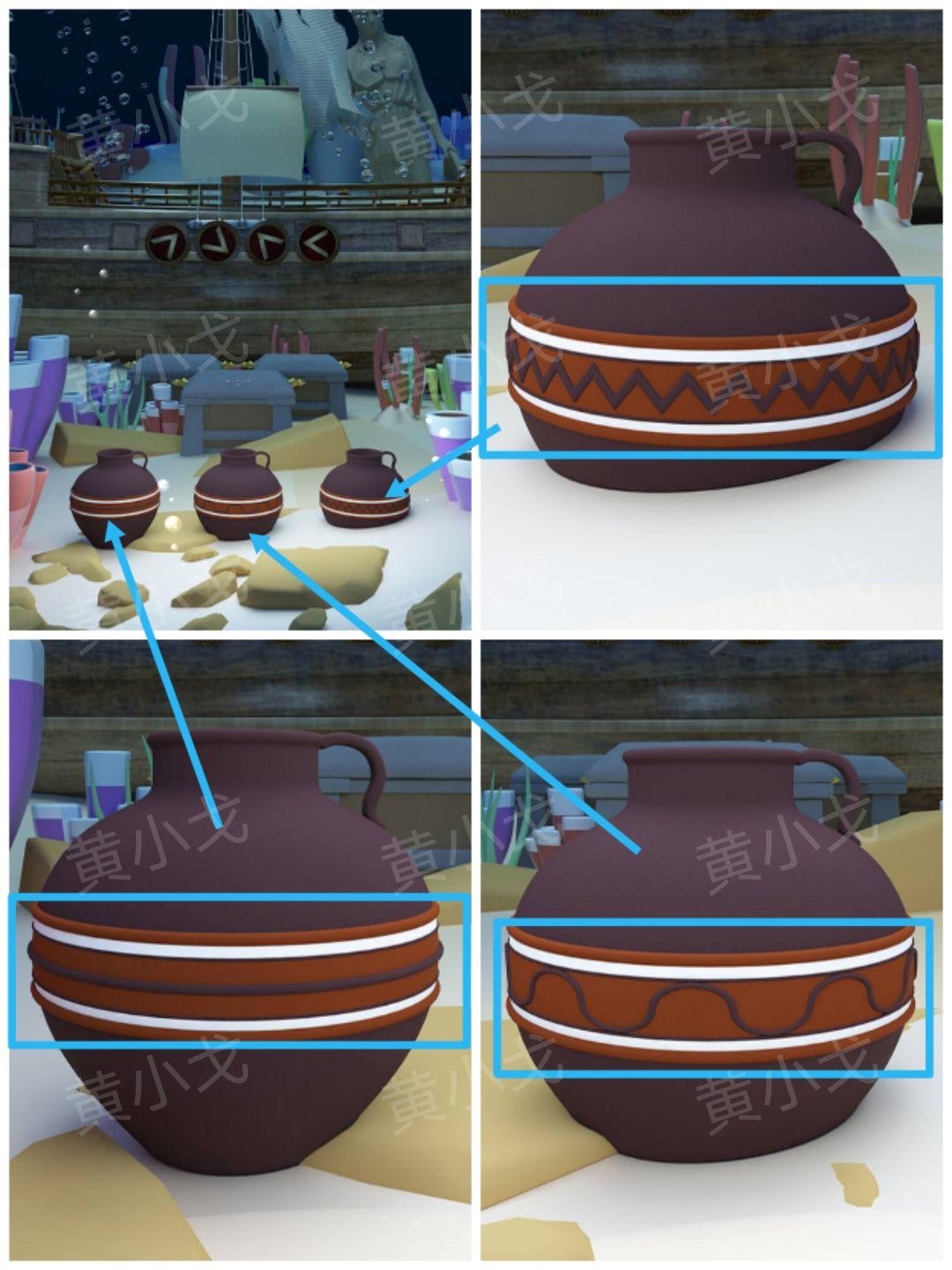 8.点击墙边的右侧石箱的上的密码锁,根据[河底]场景陶罐上的条纹线索,调整密码锁
