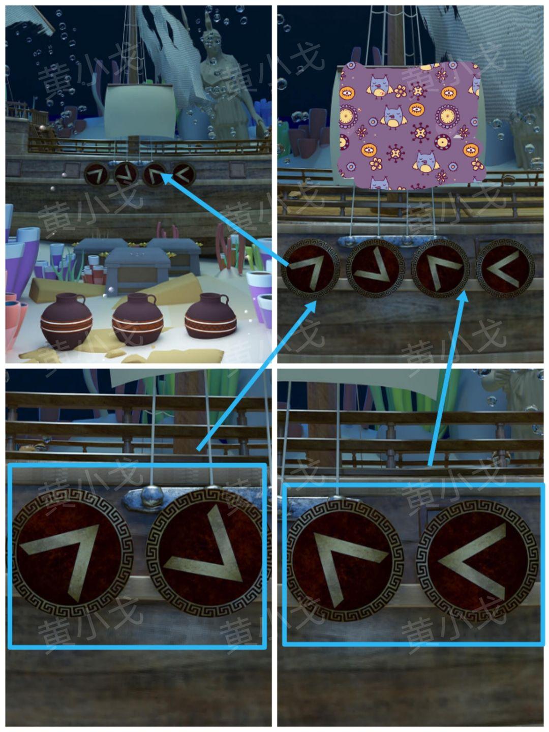 6.点击墙边的右侧石箱上的密码锁,根据[河底]场景船上的圆形装饰品线索,调整密码锁上三角形的朝向