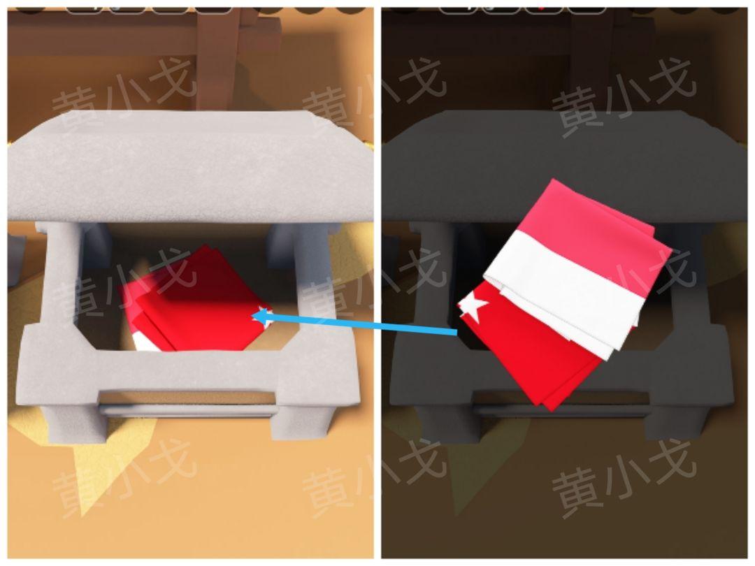 4.点击摆台前面的右侧箱子上的密码锁,根据[宫殿外]头盔上的盔冠红白条纹宽度线索,调整密码锁