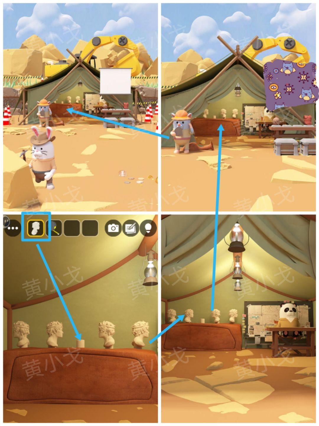 29.点击左上角的箱子上的密码锁,根据[拱门]场景海狮手上的书本线索和[帐篷]场景石头上的图案线索,调整密码锁