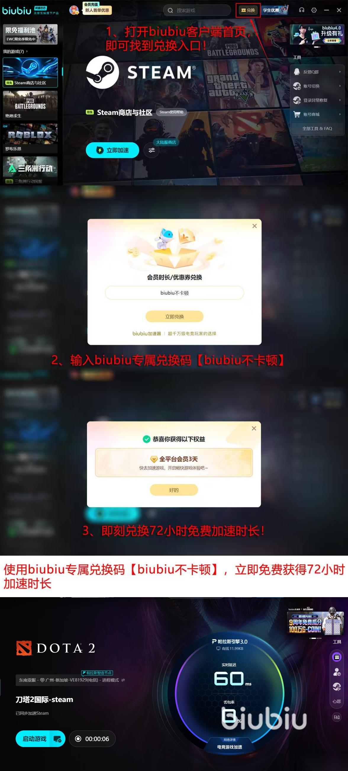 这款加速器还有很多让人惊喜的点,XDD小叮当都为它代言,还是PUBG冠军选手小叮当指定用的加速器,它用的是独立自研的帕拉斯3.0引擎,性能拉满,处理网络问题的速度特别快。新人第一次注册,直接就能领24小时免费加速,要是输入兑换码【biubiu不卡顿】,还能再领72小时,加起来一共96小时,相当于四天免费使用,试完觉得好用再决定要不要继续用,特别贴心。