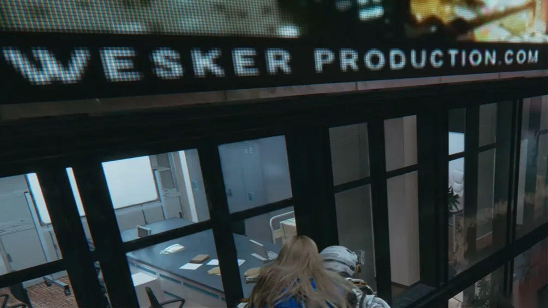 什么?在 Pragmata 里还有关于 生化危机4:重制版 的彩蛋和致敬?!当然有,而且这个彩蛋很容易被错过,因为它位于游戏“大规模生产阵列”区域中令人惊叹的时代广场区域的一块滚动牌上。在宏伟的通讯塔附近,你会看到一个滚动显示“Wesker Production”网站文字的。