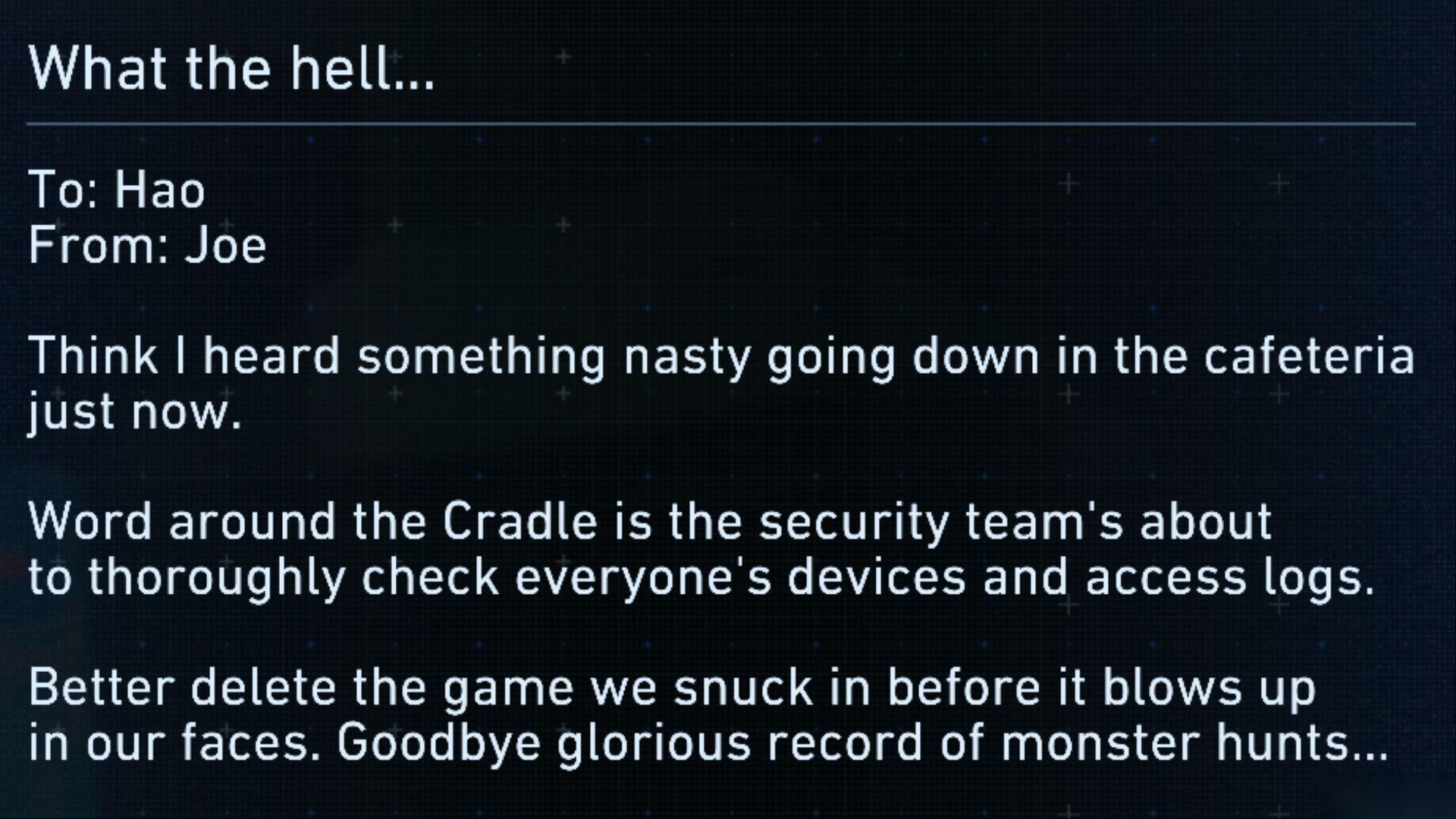 在起重机操作场建筑的二楼找到平板电脑后,你可以阅读一封标题为“搞什么鬼……”的邮件,Hao 在信中解释说安保部门将彻底检查他们的日志和设备,迫使他们删掉偷偷装在设备上的一款游戏。随后 Hao 写道:“再见了,那光荣的怪物狩猎记录……”,这显然是对出色的 Monster Hunter Stories 3: 命运双龙 系列的致敬。即使是在偏僻角落发现的收藏品中,也充满了彩蛋和致敬!