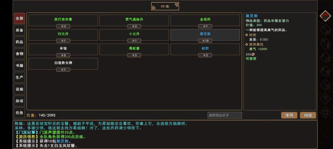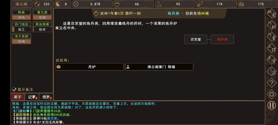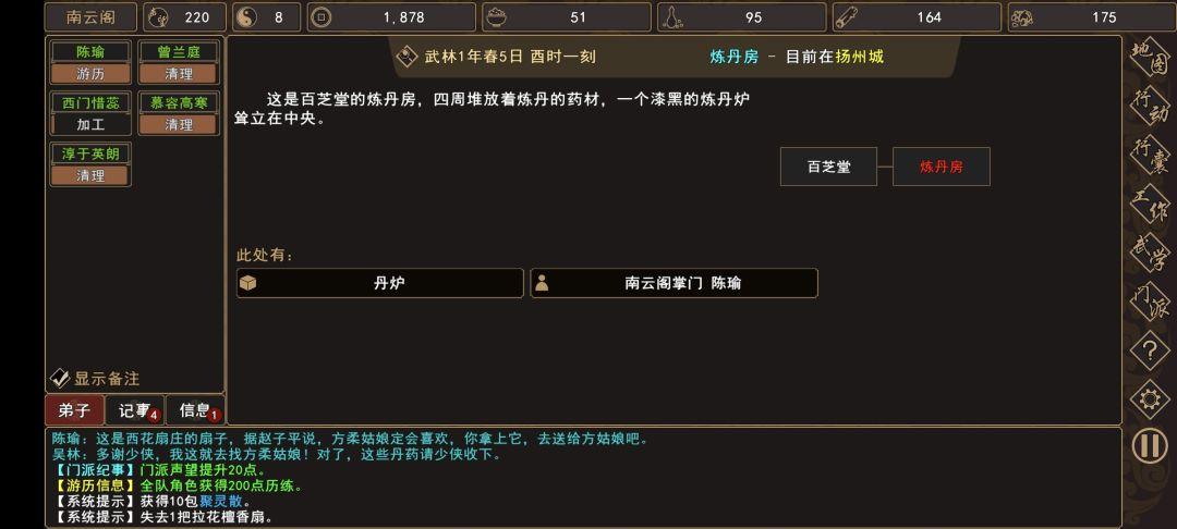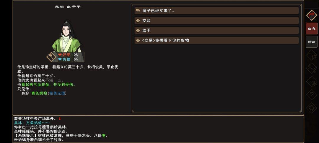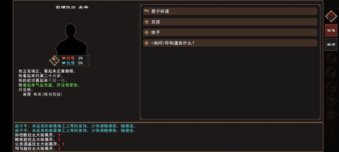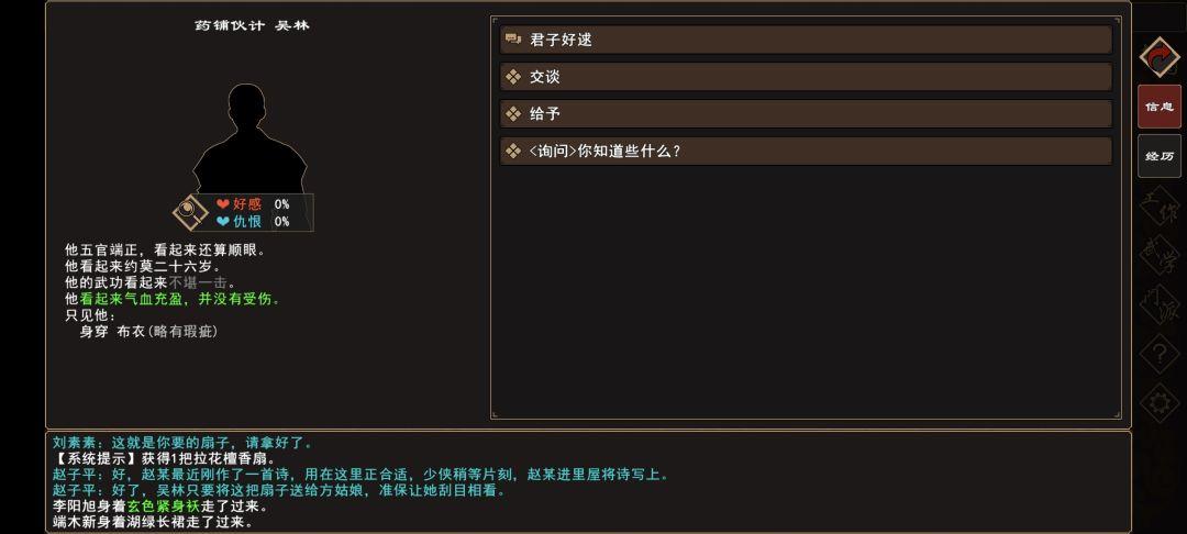 (4)前往 扬州城→炼丹房→[人物:药铺伙计 吴平]对话 选择:“君子好逑。”