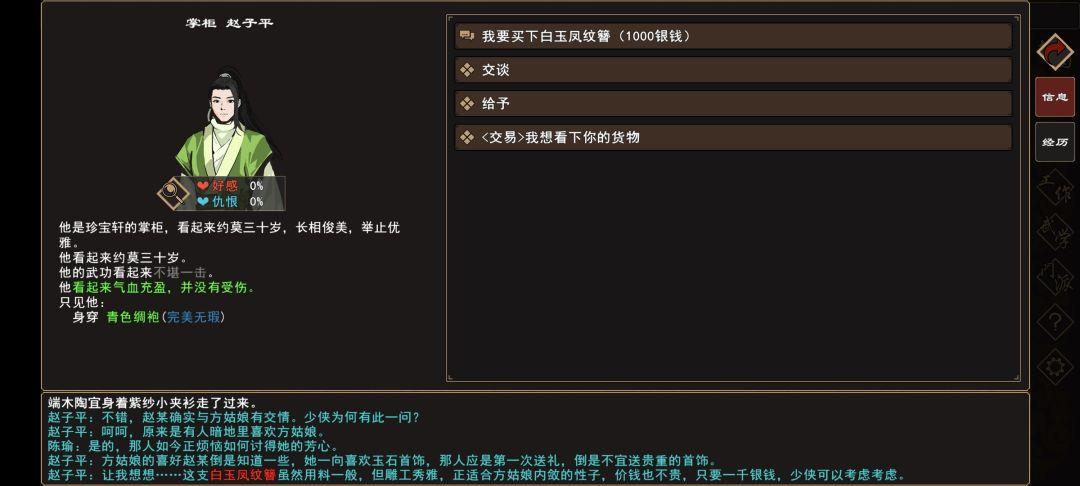 (2)前往 扬州城→珍宝轩→[人物:掌柜 赵子平]处购买[白玉凤纹簪],需要1000银钱。