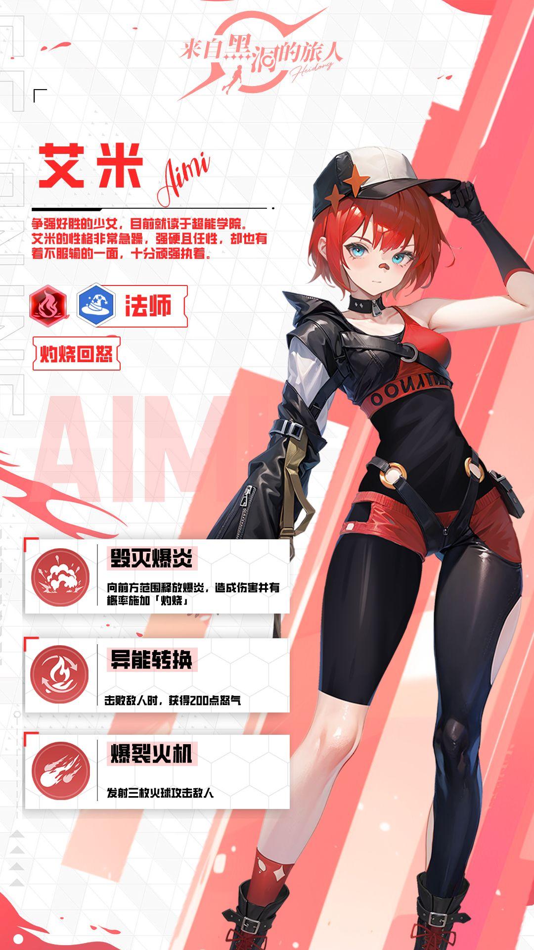 《来自黑洞的旅人》战姬艾米,外号“打火机”。技能“毁灭爆炎”范围攻击并有概率施加灼烧;“异能转换”击败敌人时获得200点怒气;“爆裂火机”发射三枚火球攻击敌人。一位擅长范围灼烧与快速积攒怒气的输出型战姬。