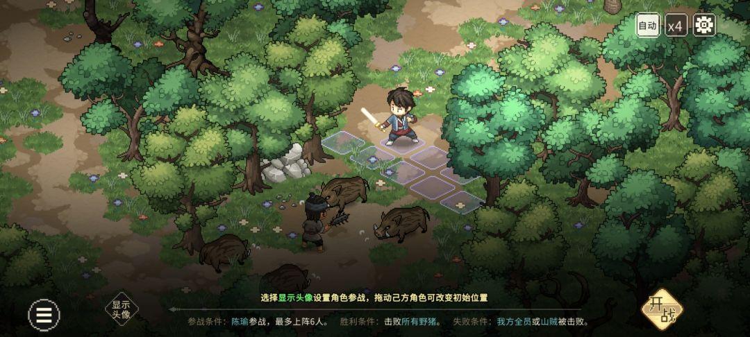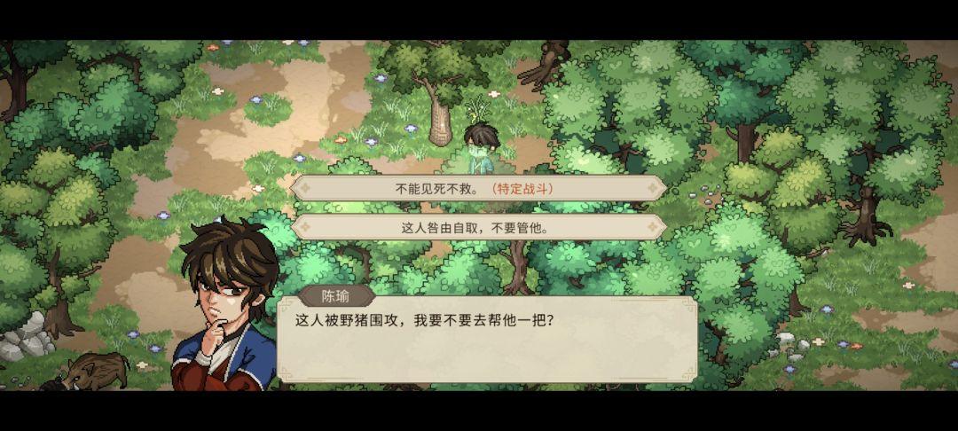 大侠立志传被围攻的山贼事件怎么触发,前往 无名地区→迷踪林(上图地图标点位置),触发过场剧情,选择:“不能见死不救……”,触发战斗(需要打4只野猪),打赢野猪后,触发过场剧情,我们会发现这山贼是个白眼狼,假装感谢,趁着我们不注意,来偷袭我们。