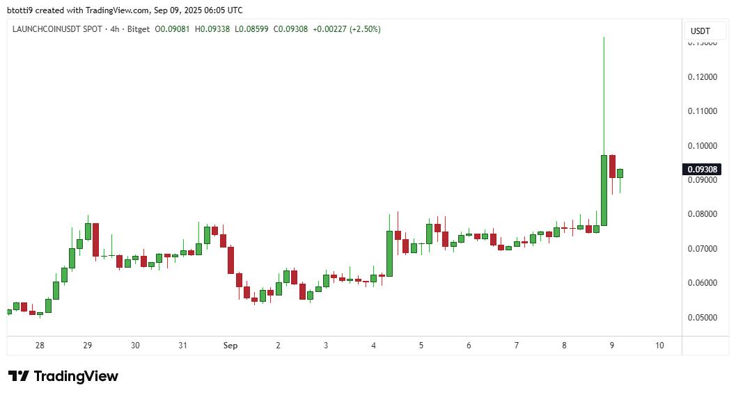 如上所述,Believe 平台上的 Launch Coin 价格经历了大幅上涨,一度飙升近 60%。在亚洲交易时段早盘交易中,LAUNCHCOIN 的价格约为 0.076 美元,随后突然飙升至 0.132 美元。