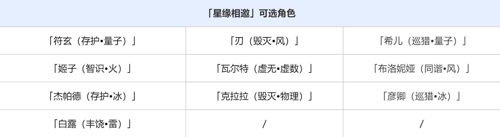 开拓者可自定义角色联动跃迁中7名「星缘相邀」角色,可选列表如下。