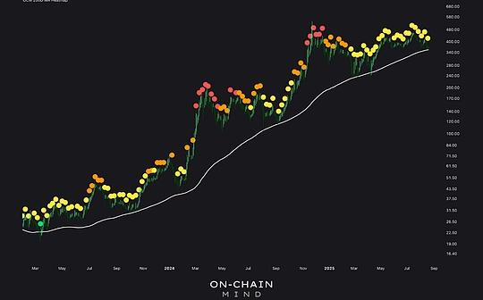 200日线图信号显示强势:MSTR 有望在本轮周期中第二次在 200 日线图上呈现绿色信号点,其交易价格处于 200 日均线 353 美元处。这一水平对多头而言是关键支撑位,标志着此轮涨势的开始。若能在此价位企稳,可能预示着强劲的上涨潜力。