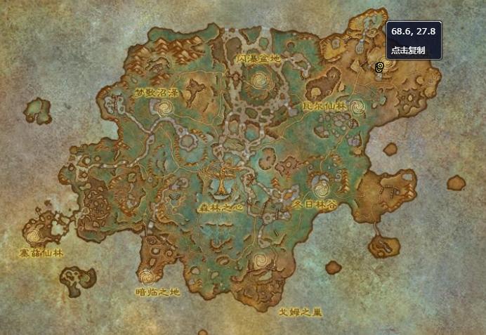 炽蓝仙野地区有3处,最密集的位置坐标是(68.6,27.8)。