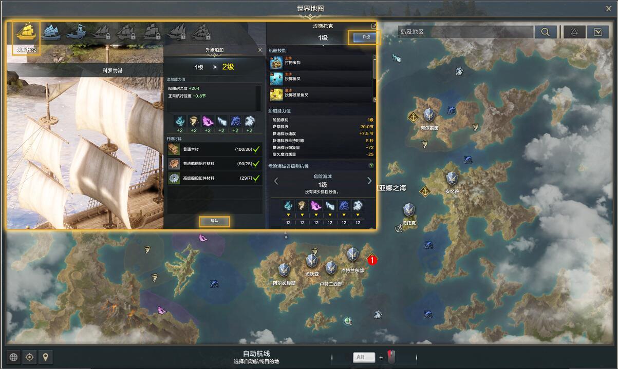 1.升级船舶,将弗兰斯、特拉贡、埃斯托克、风泊、巴克斯图姆其中一艘船升级到3级