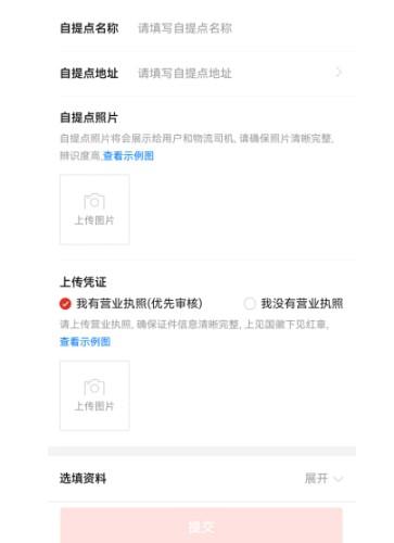 5、登录后,填写自提点名称、地址、照片,再提交相关资料认证,全部完成后点击下面的“提交”即可。