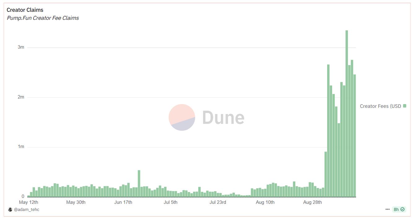 答沙丘分析师 Adam 制作的仪表盘显示,9 月份 Pump.fun 平台的创作者收入大幅飙升。前几个月,创作者平均每天获得 25 万美元的收入。到 9 月份,每天的收入超过 200 万美元,有些日子甚至超过 300 万美元。