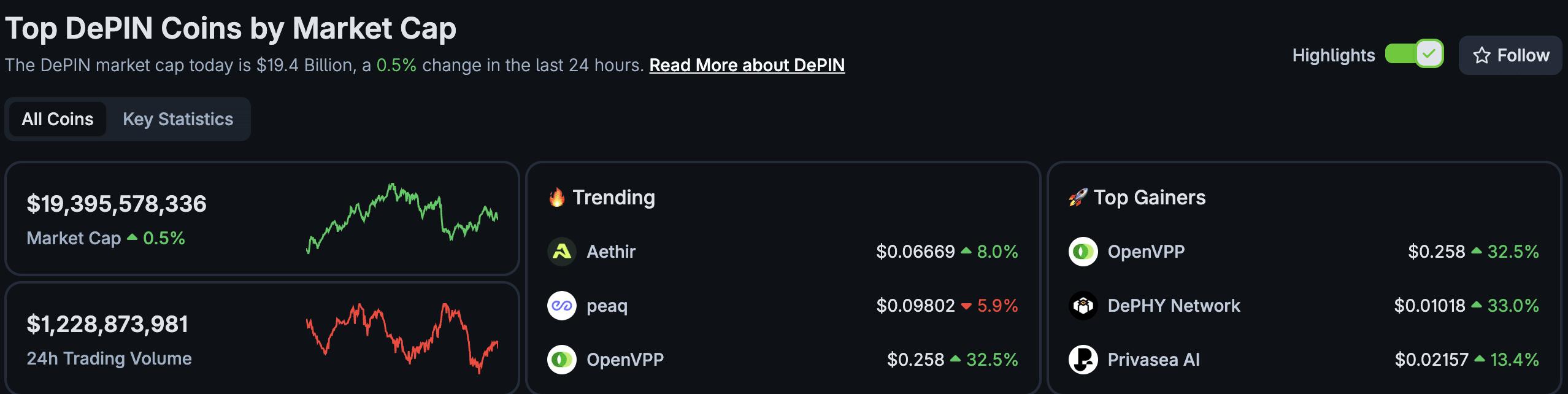 CoinGecko 上的 DePIN 类别总价值为 194 亿美元,日交易量为 12 亿美元。该板块隔夜上涨了 0.5%,Filecoin 和 Akave Cloud 推出的兼容 S3 的新存储服务可能会进一步提振该板块。