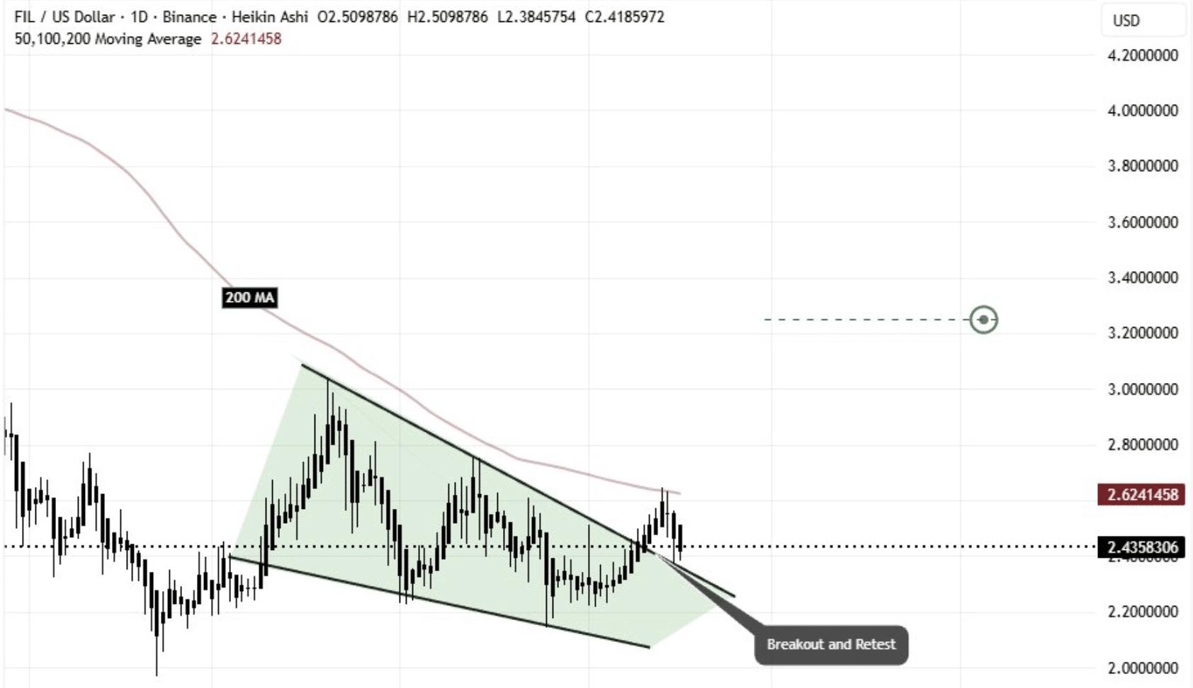 根据楔形突破预测,FIL 可能攀升至 3.20 美元至 3.25 美元区间,较当前水平上涨近 33%。
