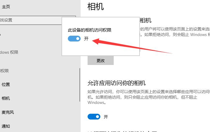 3、将访问权限改为“开”这样就可以打开摄像头了,如下图所示。