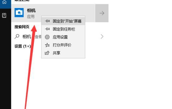 4、接下来我们回到桌面,点击开始菜单按钮,在小娜搜索框中输入“相机”,点击一下就可以打开摄像头了,也可以右键点击相机,将相机应用固定到任务栏或者是固定到“开始”屏幕上,如下图所示。