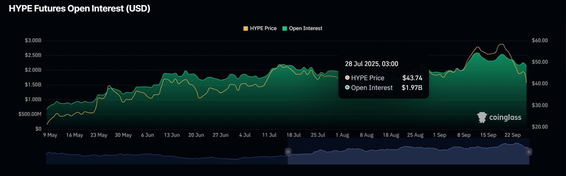 尽管这一声明意义重大,HYPE 的价格反应疲软。该代币在过去24小时内下跌1.24%,至42.41美元,周跌幅超过25%。市场数据显示,该代币在40.11美元至43.46美元之间窄幅盘整。与此同时,HYPE代币的未平仓合约在过去一天上涨了3.31%,达到22亿美元。