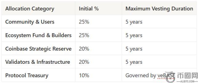 BASE 代币分配和最长归属期限实例,实际的归属期限可能会根据精确的自适应排放参数化而改变。