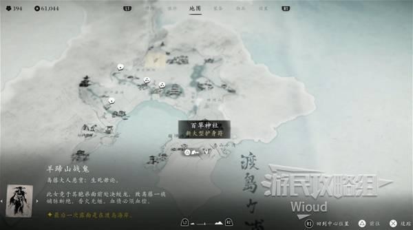 【渡岛海岸】位置如下图所示,走到山顶祭拜神社可获得【建御雷神护身符】。
