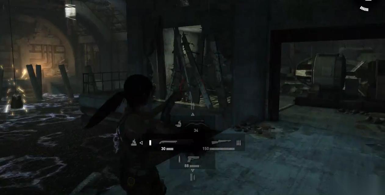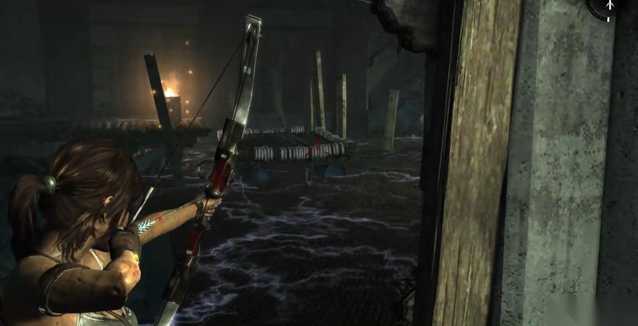 前方的路会被带有电流的水阻挡,这时需要把镜头往左上方移。可以看到一个木头,这里连接着房间中心的电灯。也正是因为带点的灯掉入水中,才导致整个水域都被电流充斥。所以这时要利用弓箭将木头拉下,这样电灯就会短暂的离开水域。等到松开绳子的时候,电灯会再次落入水中。所以要趁着电灯还未落入水面前,快速向前走,抵达对岸。