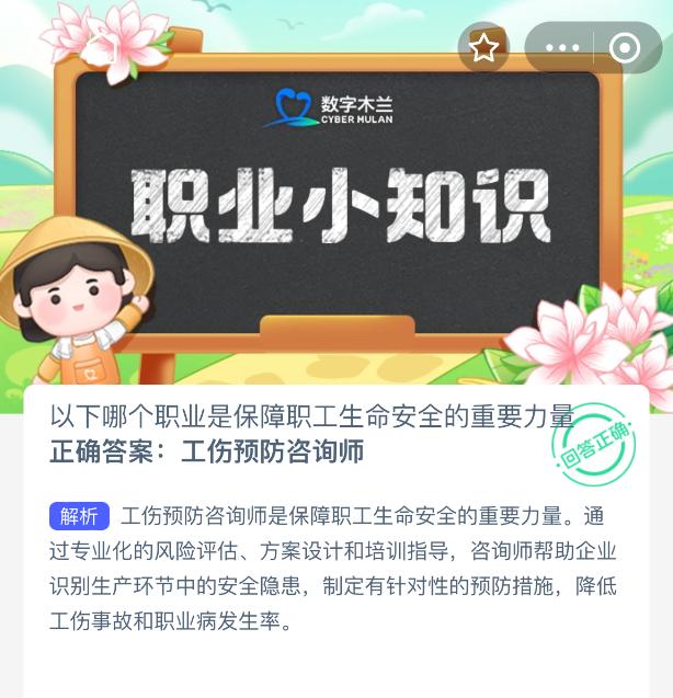 以下哪个职业是保障职工生命安全的重要力量?【蚂蚁新村每日一题】2025年10月21日题目已发布!坚持答题,积累木兰币,即可加速小镇建设。答对本题,立即可享“产速+3/时”的加速奖励!今天正确答案是【工伤预防咨询师】。工伤预防咨询师是保障职工生命安全的重要力量。