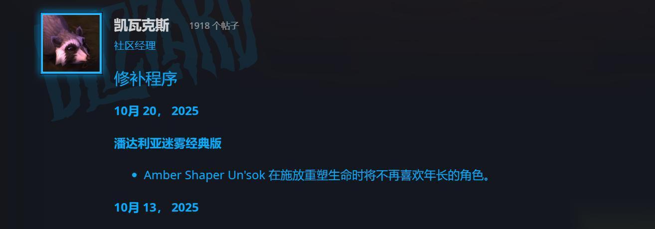 暴雪蓝贴的内容是:“塑珀者翁索克在施放重塑生命时将不再喜欢年长的角色。”
