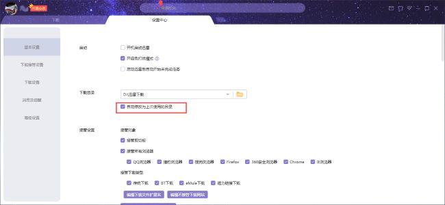 2、在打开的窗口界面中,找到右侧"下载目录"中的"自动修改为上次使用的目录",将其小方框勾选上即可。