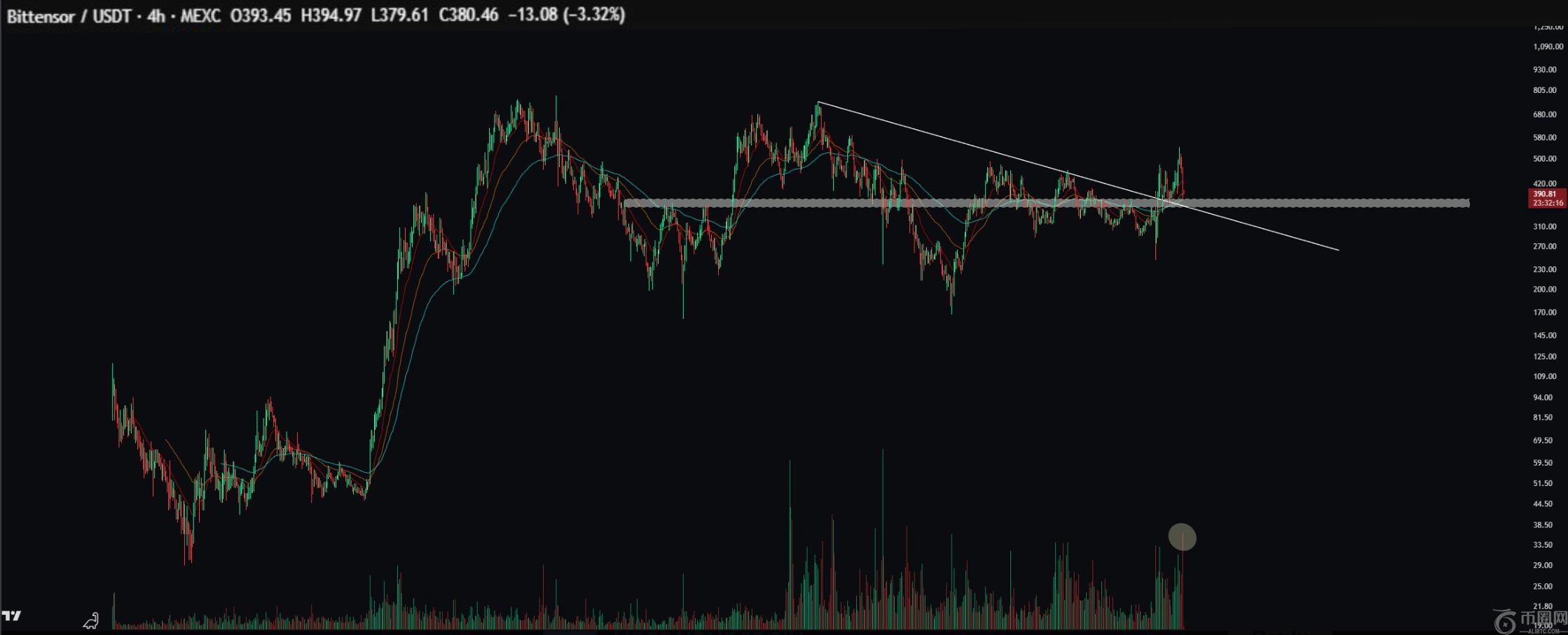 TAO价格刚刚跌破380美元的关键支撑位,成交量对买方构成压力。过去几天,卖方成交量一直超过买方成交量。买方需要在此位置入场,才能守住下图所示的白色区域。