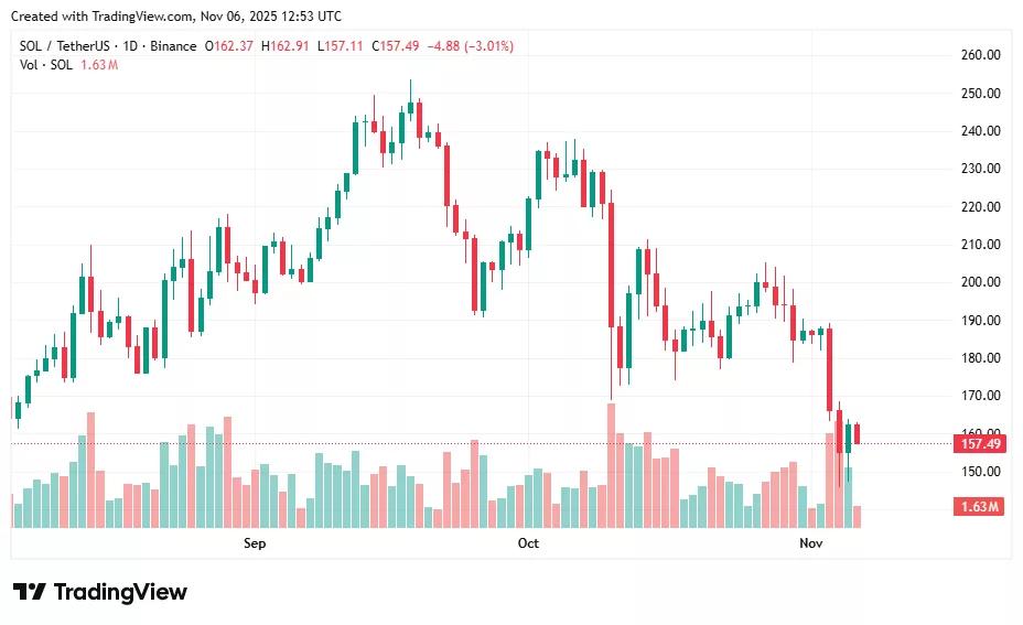 在股价跌至 185 美元后失去上涨势头,Solana(SOL该货币对跌破 180 美元支撑位,目前在 160 美元附近交易,暗示短期内可能出现下跌趋势。阻力位在 175 美元附近,其 870 亿美元的市值使其在全球加密资产中名列前茅。