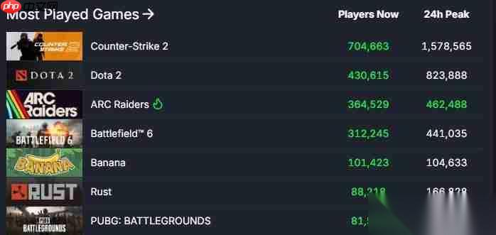 根据SteamDB的统计,《ARC Raiders》的同时在线玩家峰值已突破46万,跃居Steam热门游戏排行榜第三名,仅次于《CS2》与《Dota2》。相较之下,《战地6》目前的在线人数约为44万,位列第四,且有迹象显示部分《战地6》玩家正在转向《ARC Raiders》。需注意的是,该数据仅涵盖Steam平台表现,由于两款作品均登陆PS5与Xbox Series X/S,《战地6》在主机平台可能仍具优势。