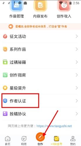 1、进入淘故事后,首先点击下方的“创作”,将页面下滑,点击“作者认证”;