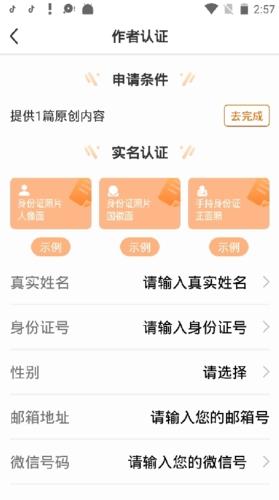 2、在作者认证页面,在已经有一篇原创作品的前提下,将个人信息全部填写正确,最好点击下方的“认证”,即可成为淘故事的作者。