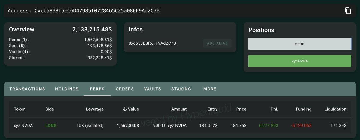 根据交易员 Hyperliquid 地址的链上数据,xyz:NVDA 仓位以 10 倍独立杠杆开仓,入场价格略高于 184 美元。