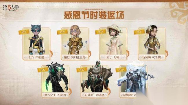 11月20日维护更新后,感恩节活动正式开启。为了感谢各位访客长久以来支持,《第五人格》将开启全角色限免使用活动,全服发放角色解锁卡、时装6折卡等感恩节福利,本次时装6折卡持续时间将延长至2026年3月31日。