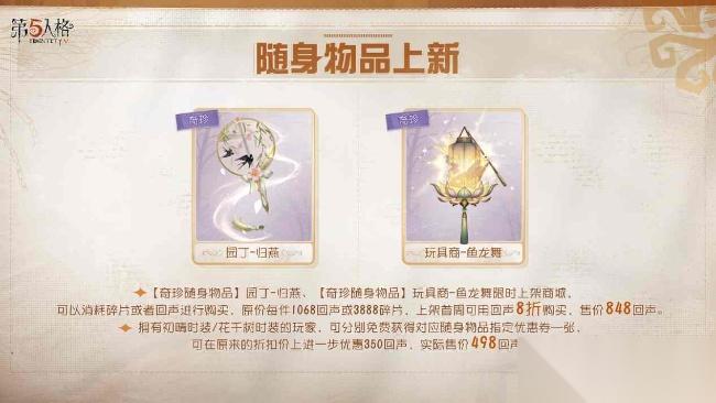 感恩节期间,园丁-初晴、玩具商-花千树全新配套【奇珍随身物品】园丁-归燕、玩具商-鱼龙舞也将同步上架!访客们可用回声或碎片进行购买。